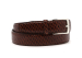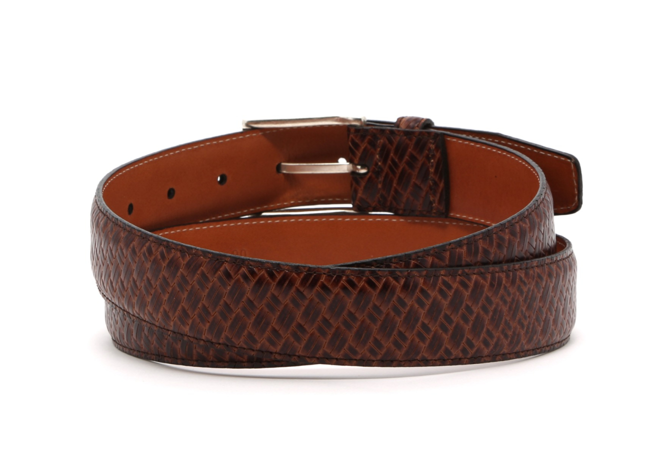 This dress belt is made from embossed basket textured-leather, that’ll look sleek with practically any trousers. It fastens with a matte silver solid brass buckle. Made in the USA.