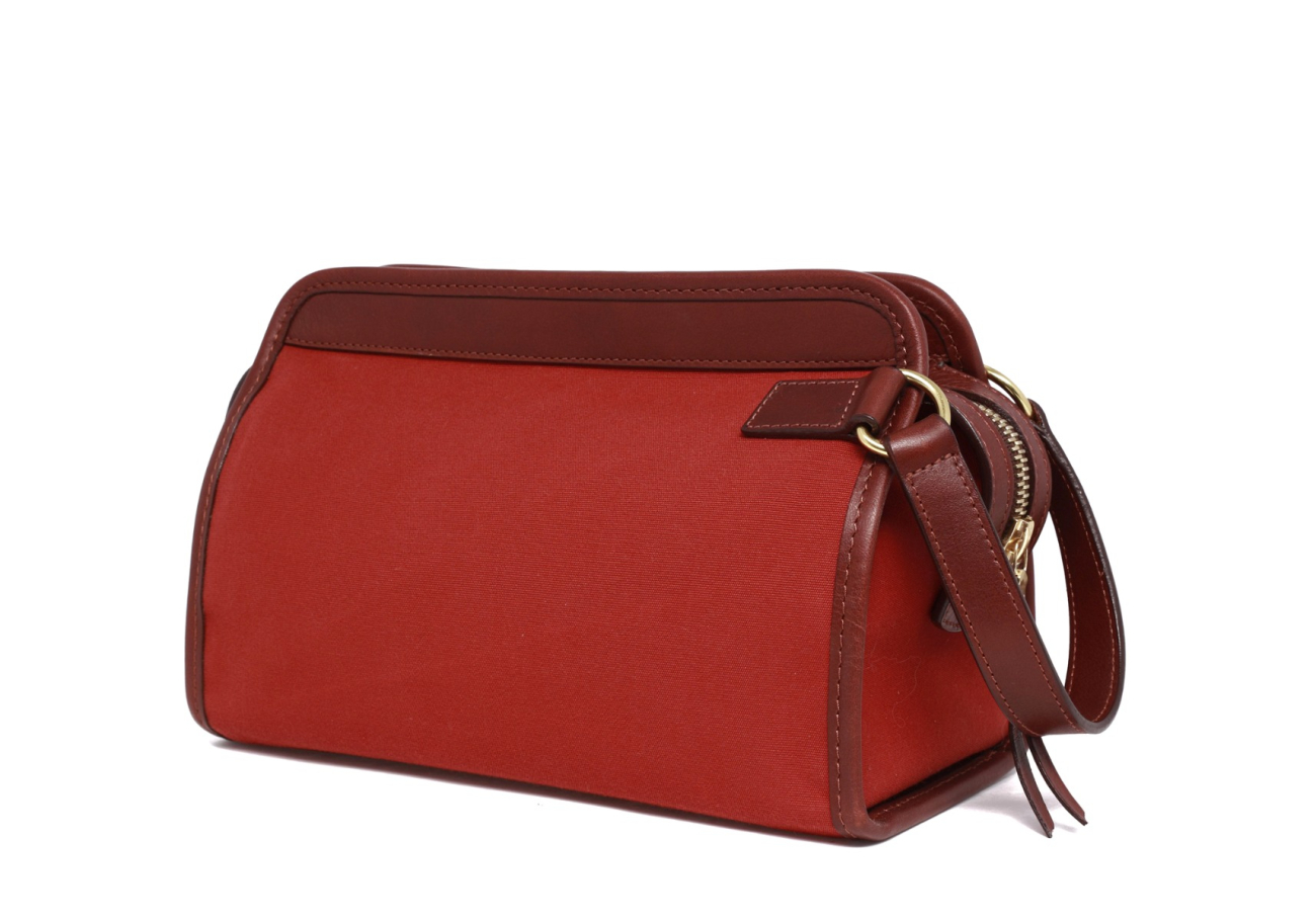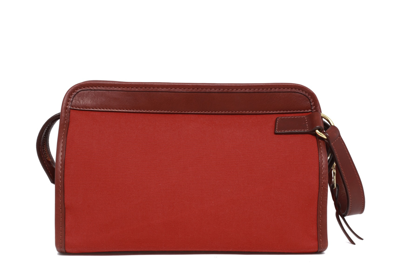 Handmade from terracotta sunbrella, this piece is a one of a kind version of the Frank Clegg Large Travel Kit. The bag is trimmed chestnut tumbled leather and lined with our signature Sunbrella. The interior includes a full zipper pocket to help keep smaller items at bay and closes with a solid brass Swiss Riri zipper.