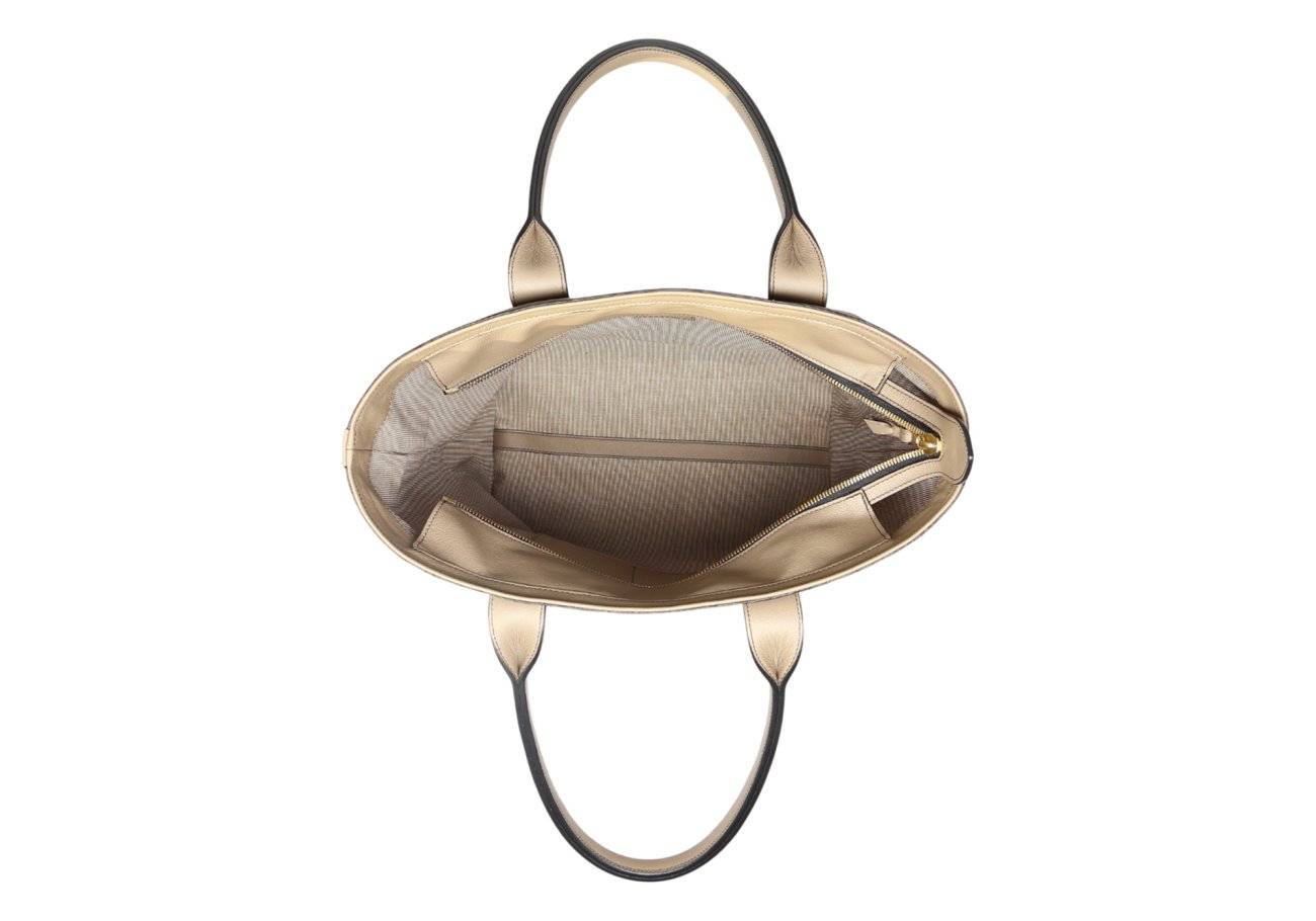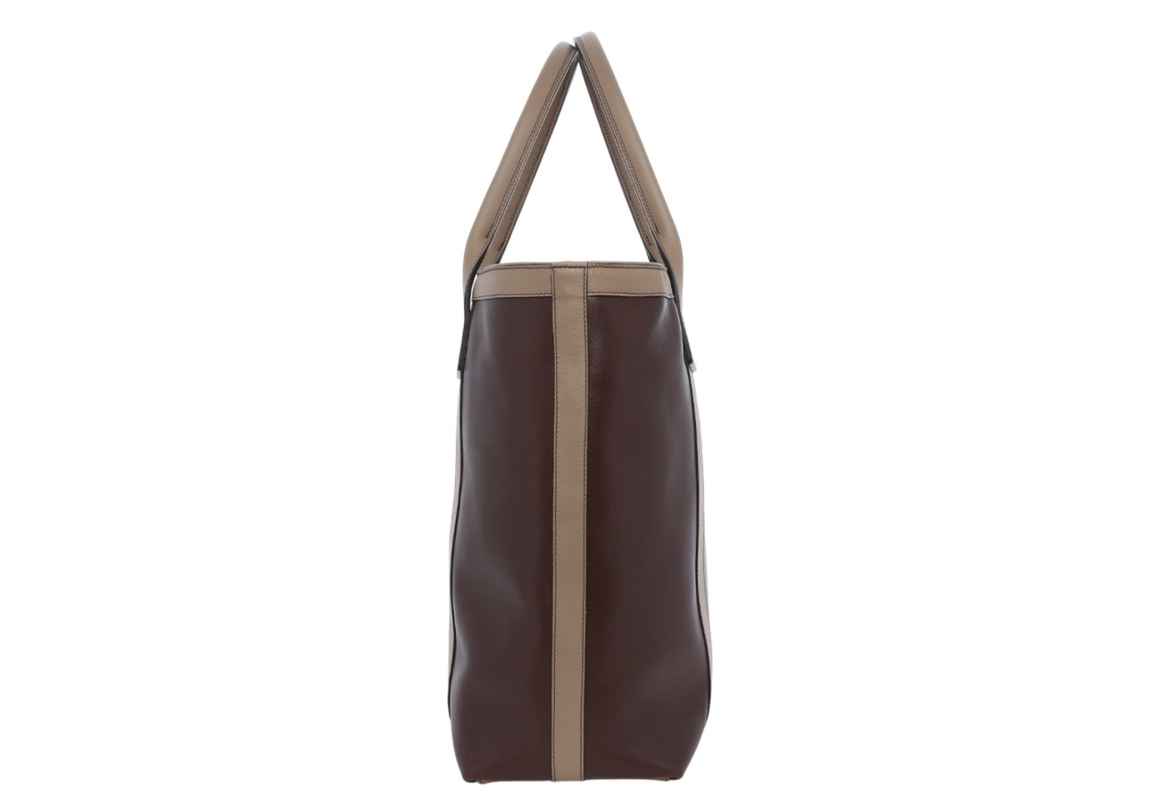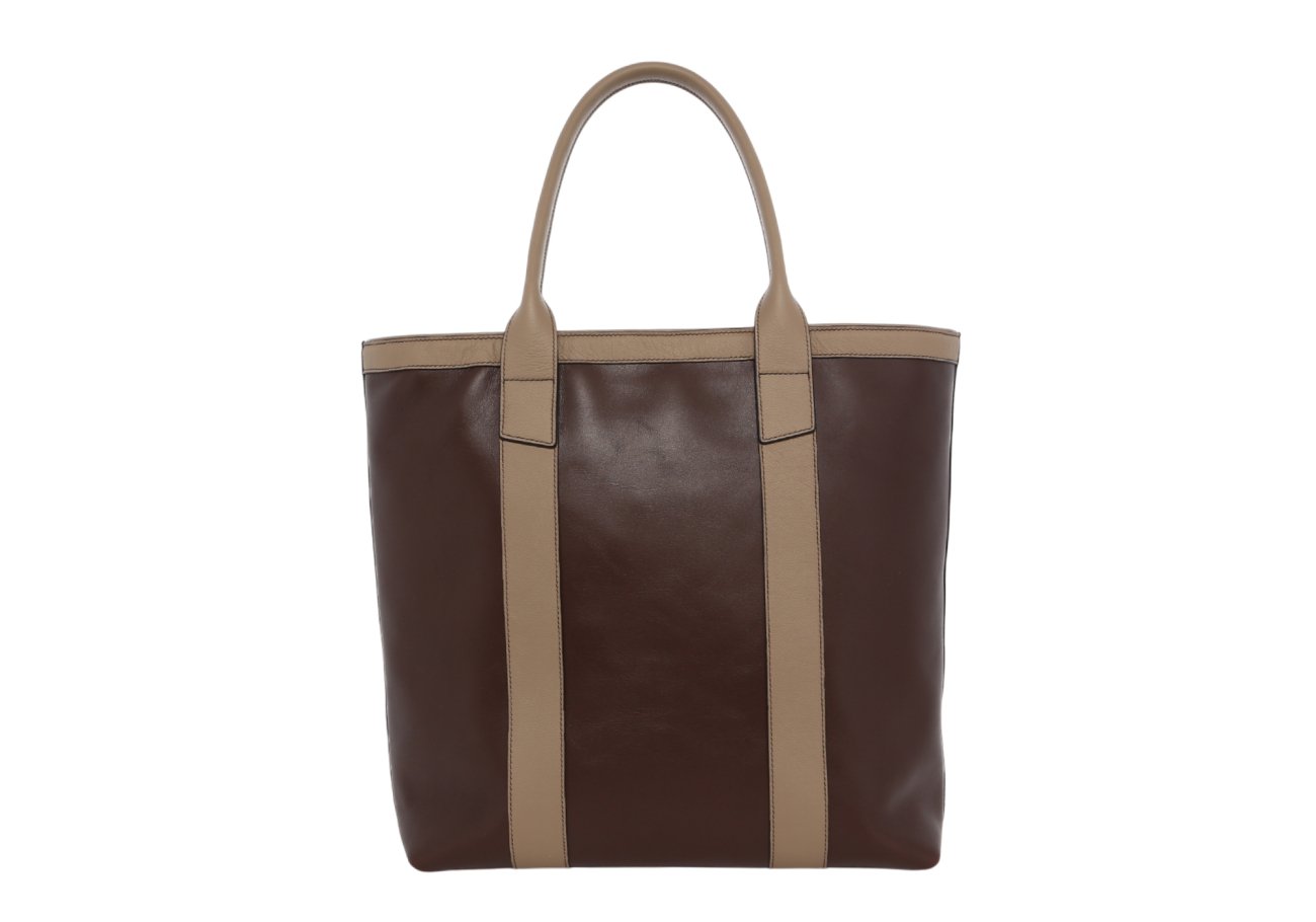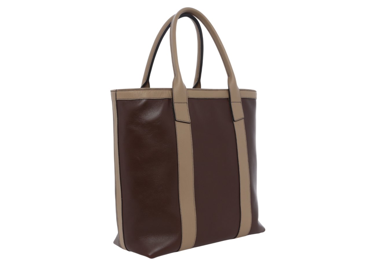 Tall Tote - Chocolate/Turtle Dove - Pebbled Leather - Zipper Closure - Linen Tweed Sunbrella