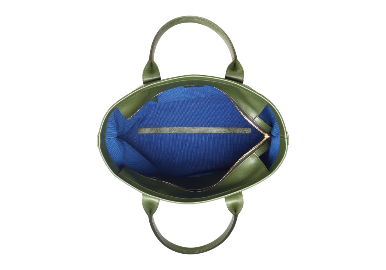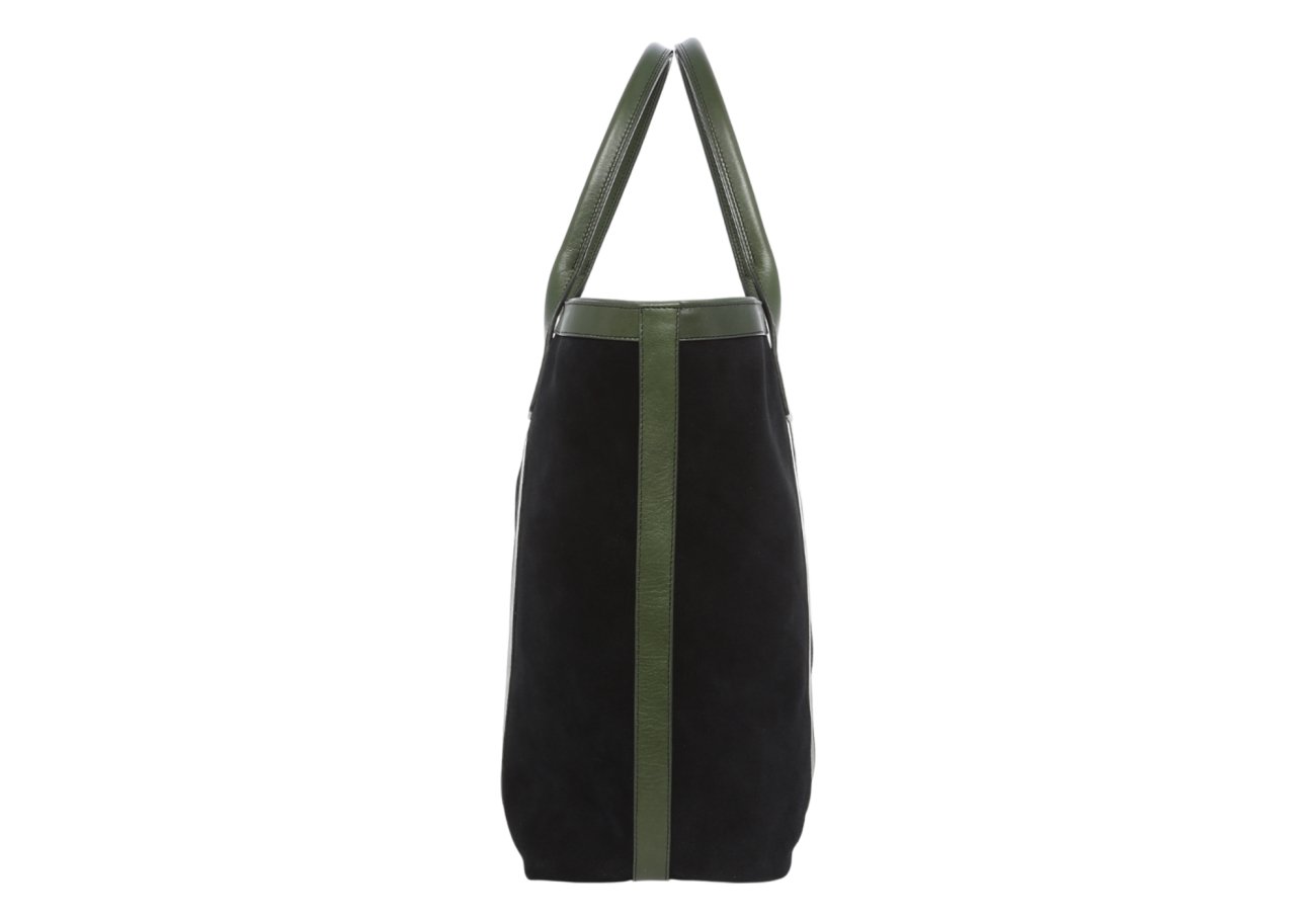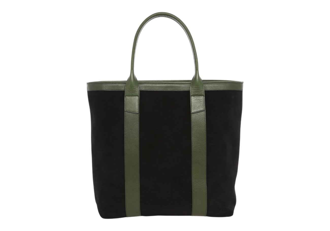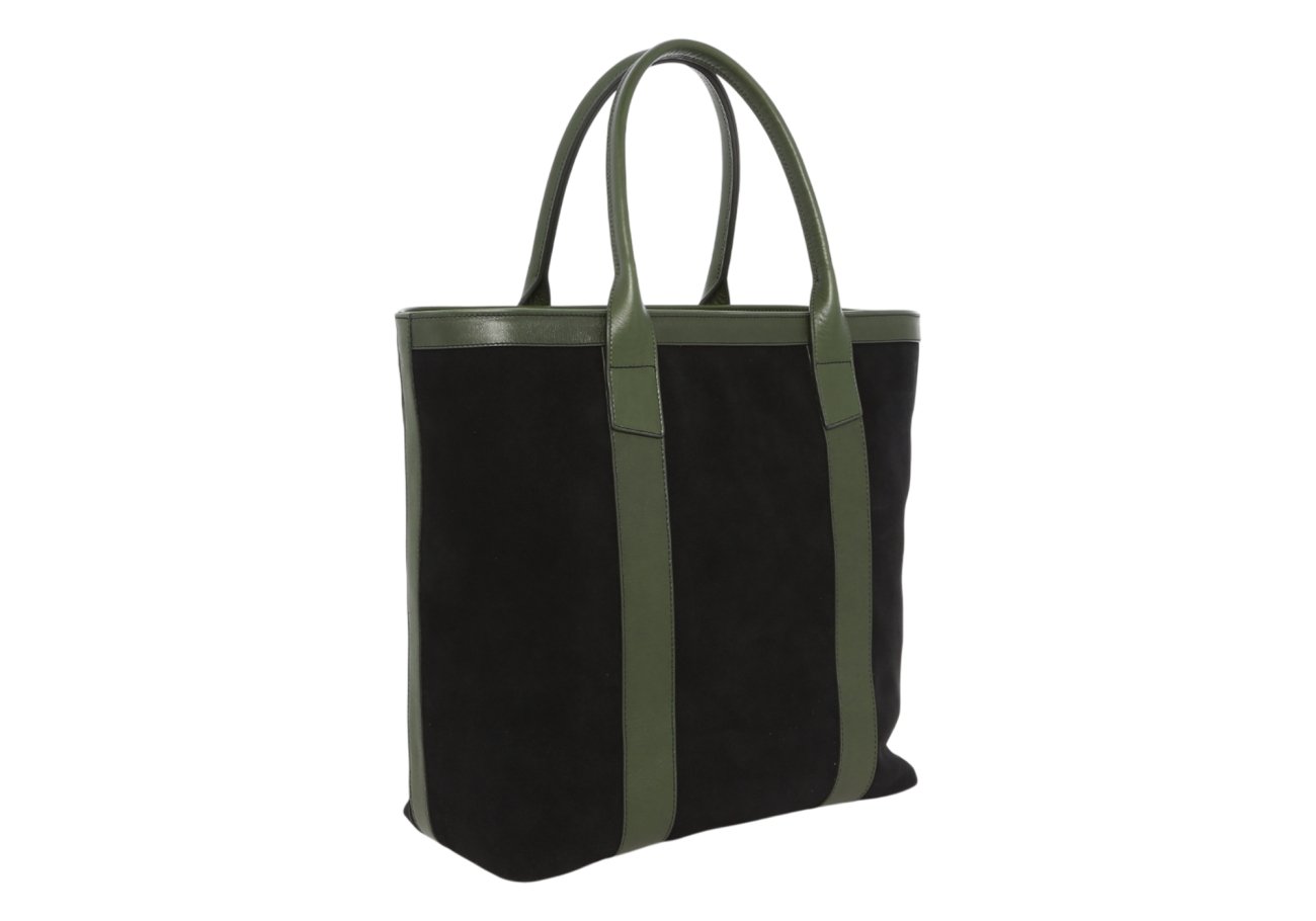 Tall Tote - Black/Green - Suede - Tumbled Leather - Zipper Closure - Royal Blue Tweed Sunbrella