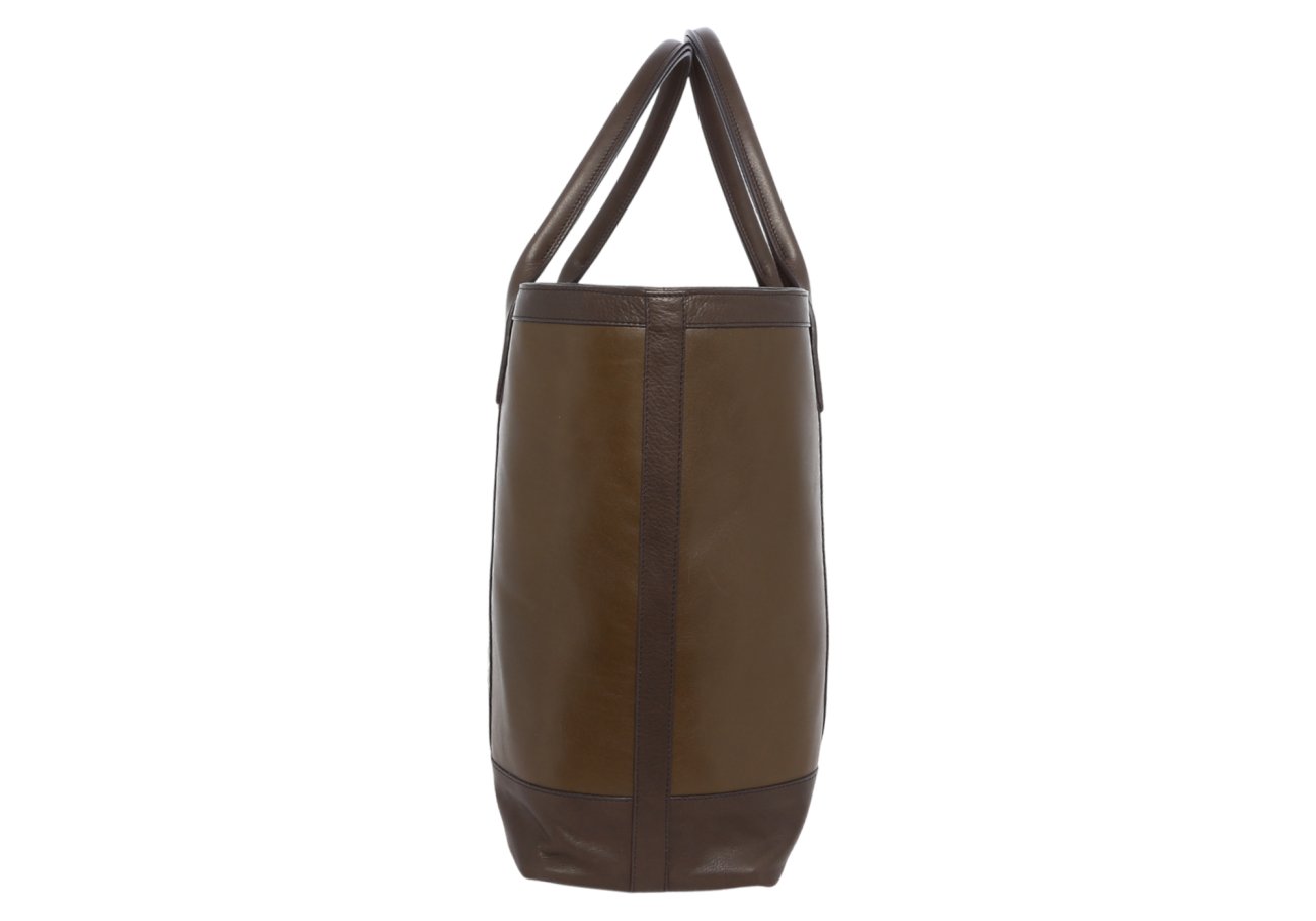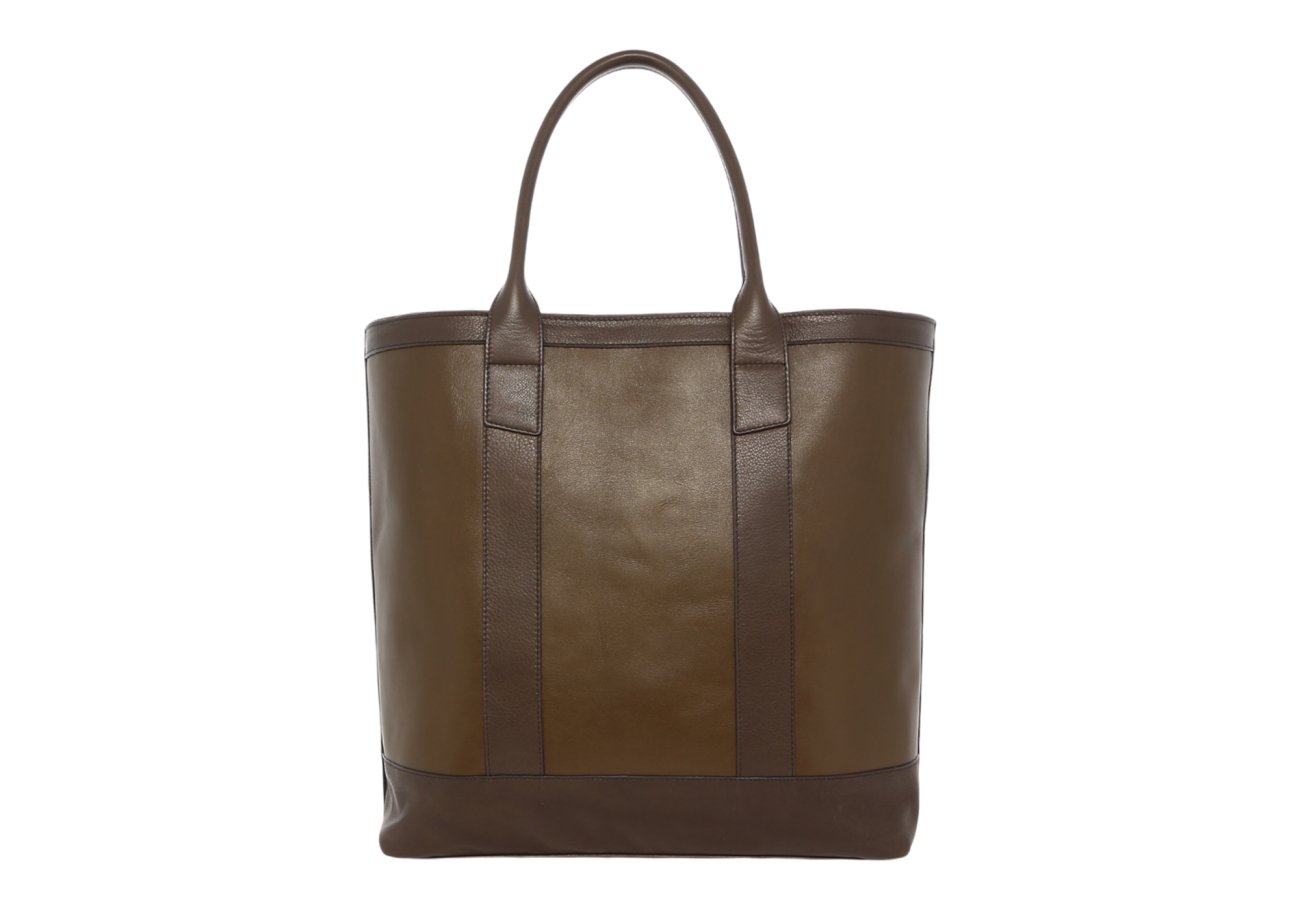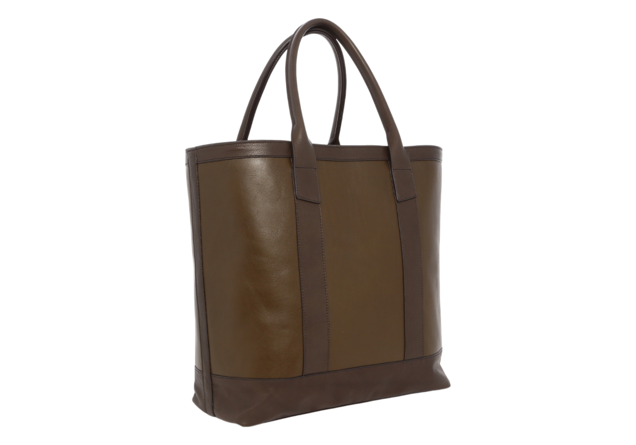 Tall Tote - Olive/Grape LeafTumbled Leather - Zipper Closure - Dubonnet Tweed Sunbrella
